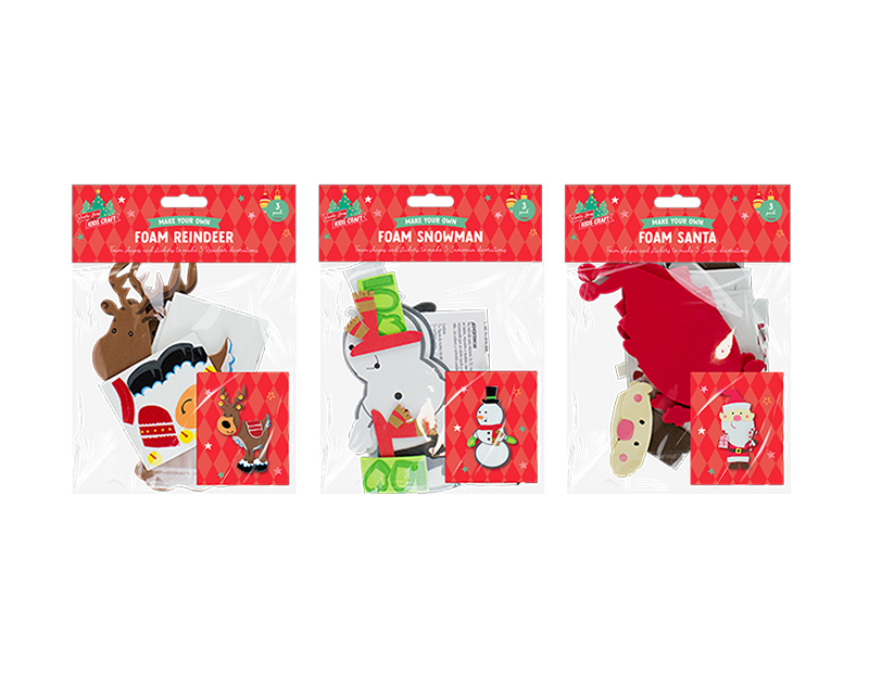 These packs of Christmas Foam Craft Characters contain an assortment of individual pieces that when assembled, make three festive characters that include reindeers, snowmen and Santas (each separate pack).